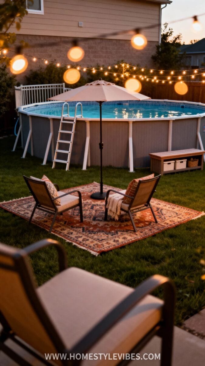 Here’s what worked for us the moment I stopped overthinking and just started placing things where they felt good—like where the sun hits in the afternoon, where you can watch the kids splash, where you can set down a drink without panic—and then I added the lights and the rug and it kind of snowballed in the best way, but the part that matters most is…