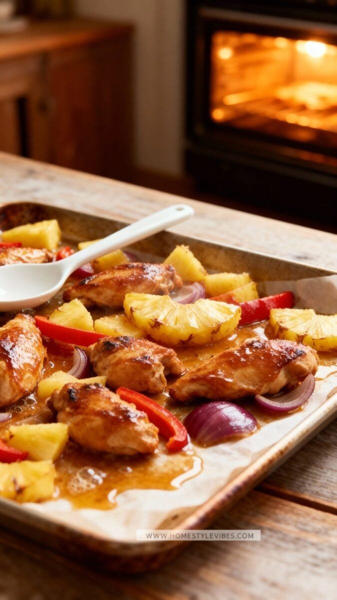 Slide the pan back in for another 8–10 minutes until the chicken cooks through and the pineapple edges look golden. And then… well, this is where things get interesting, because timing and texture matter more than you think, and if you rush it you’ll miss that final caramelized moment where everything clicks. Give it a minute. Literally. One extra minute can change the whole vibe.