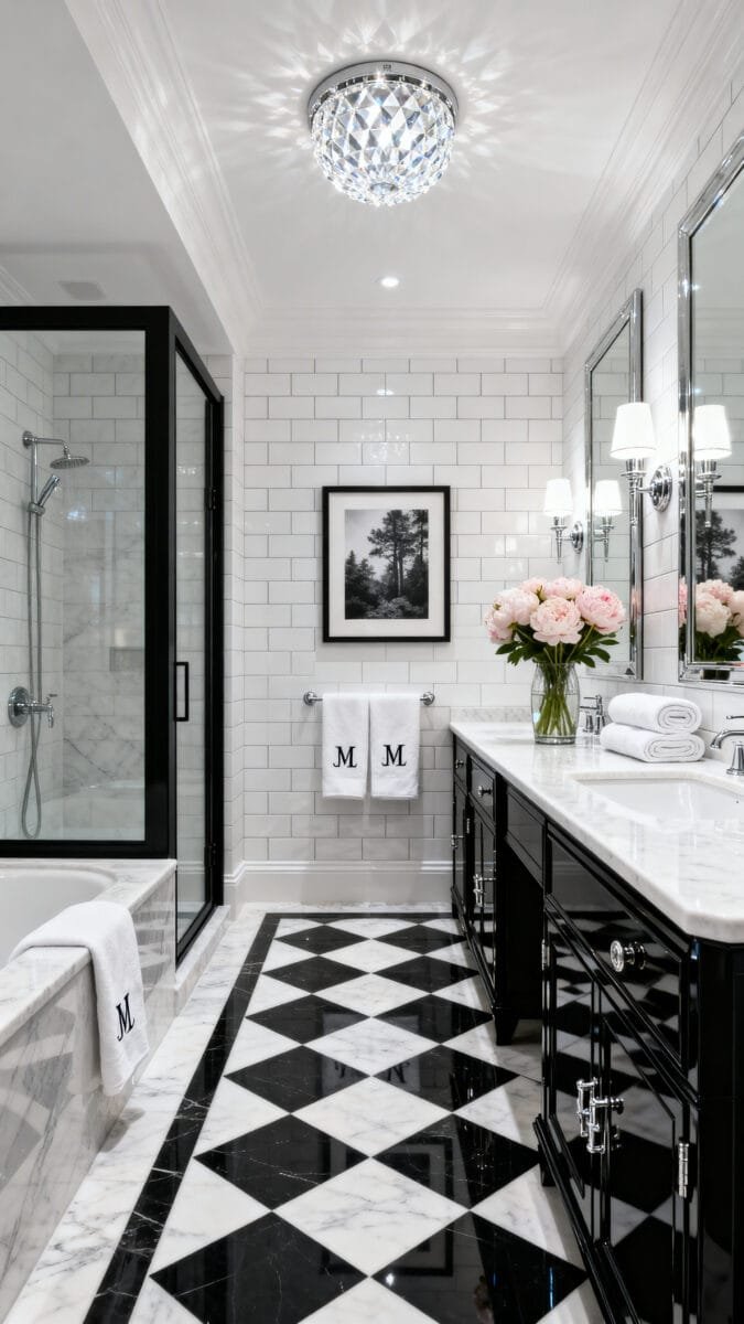 • Key Moves: Diagonal checkerboard, framed black shower door
