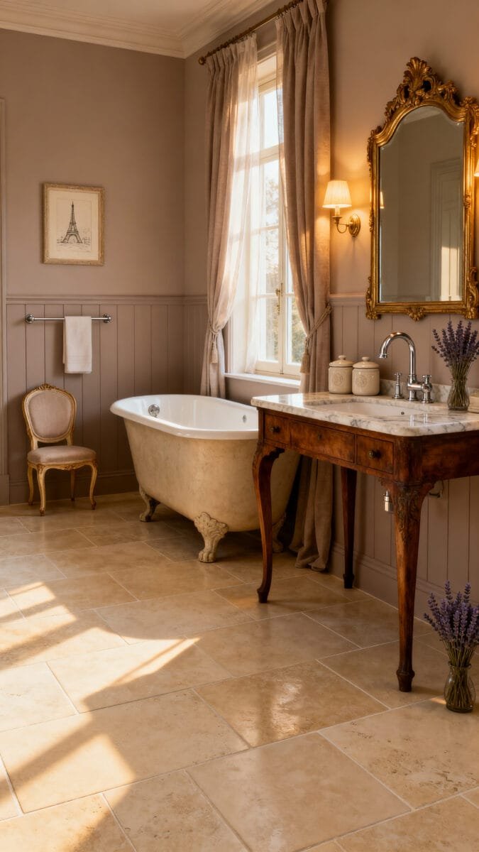3. Parisian Stone & Paneling With Clawfoot Charm
