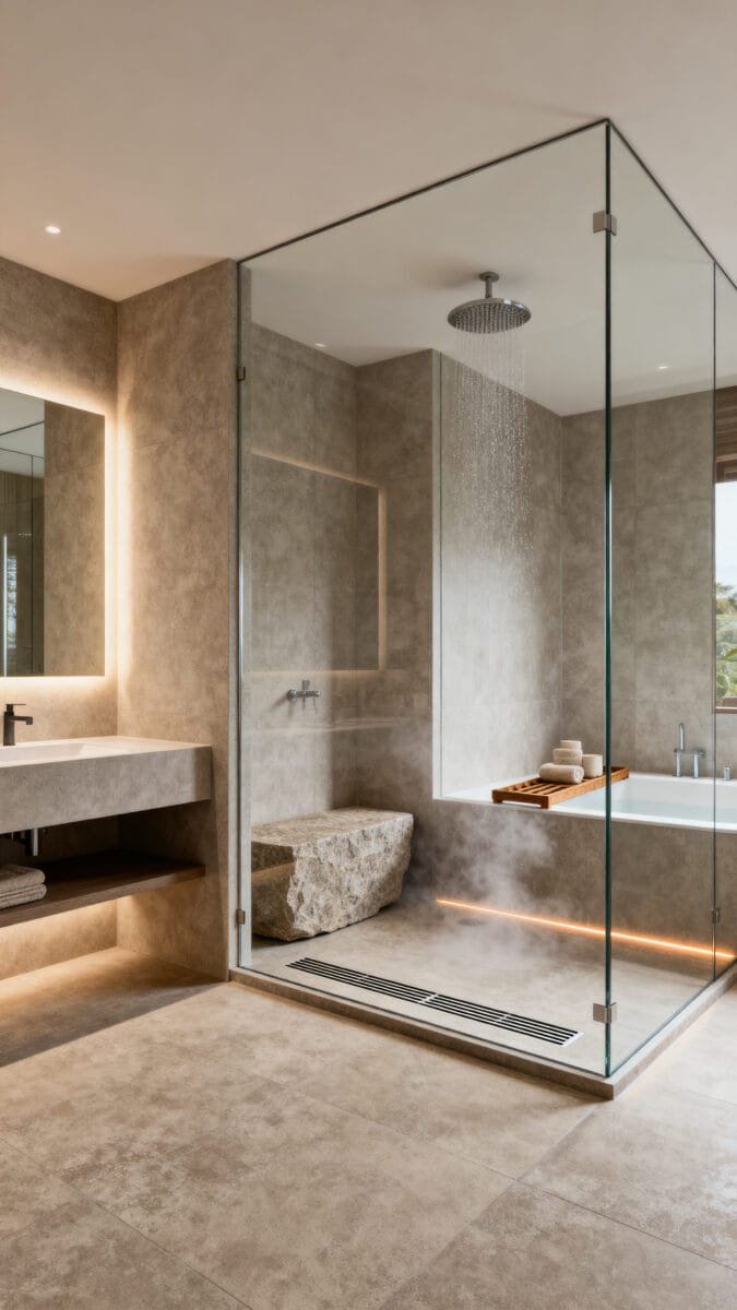 Keep everything integrated—linear niches, flush trims, hidden drains. It’s the closest you’ll get to a resort spa without leaving home.