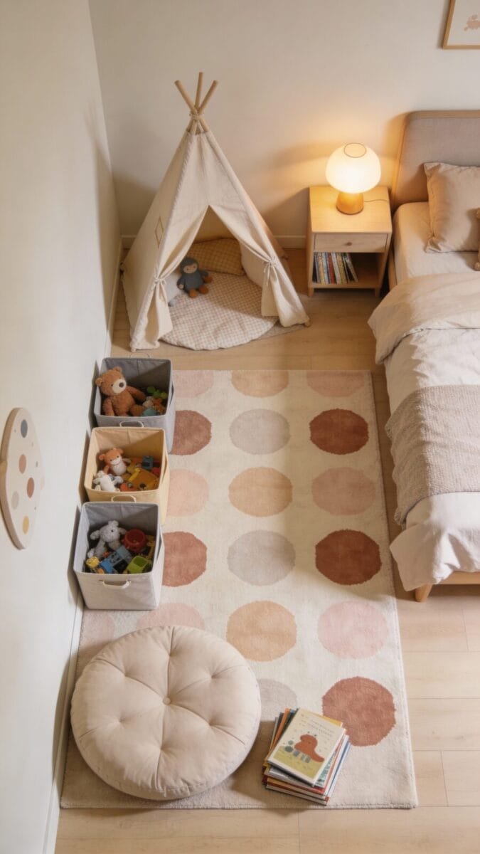 - Play zone: Open floor space, easy-access bins for quick cleanup.