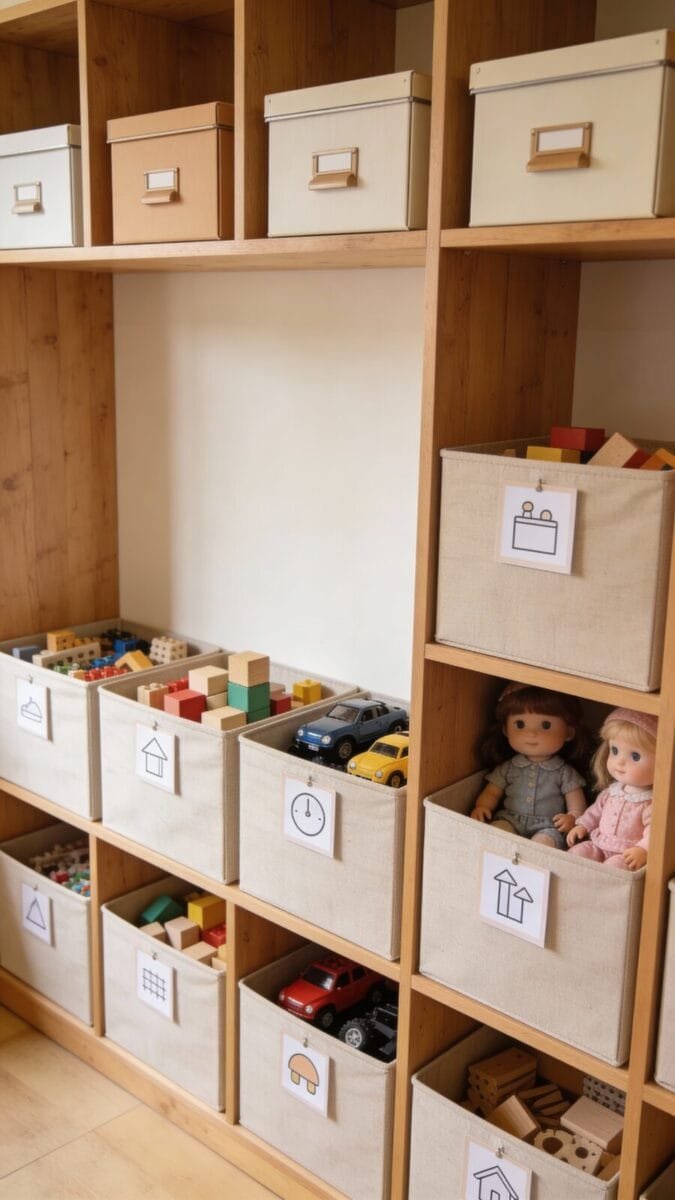 Use open bins for daily toys and lidded boxes for sets. When everything has a clear home, kids put things back without battles.