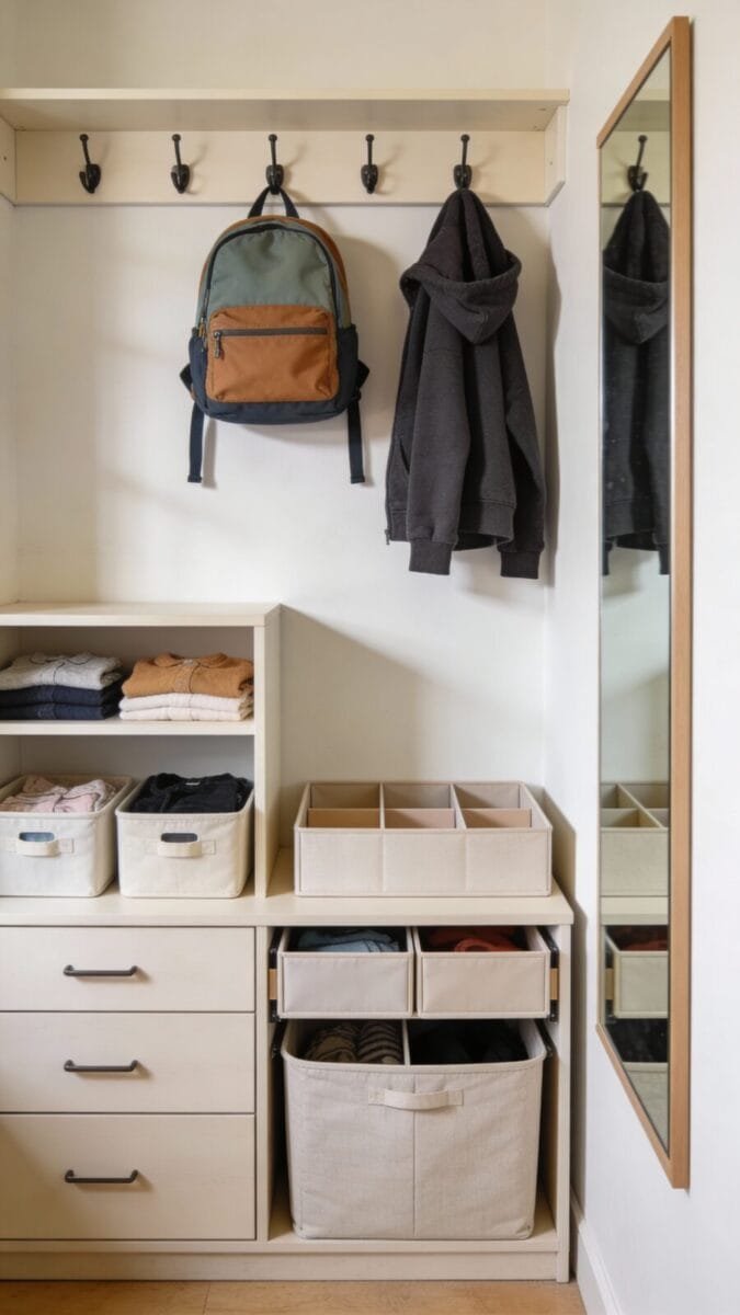- Dress zone: Hooks, labeled drawers, mirror at kid height.