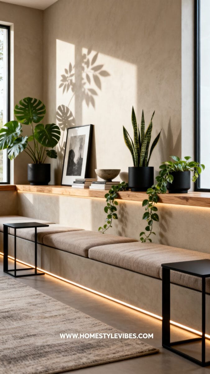 Now for a modern move: build a plant ledge right into your living room architecture. Picture a continuous, waist-high shelf or window ledge running the length of one wall, punctuated with sleek planters, sculptural lamps, and framed art. The mood feels fresh, organized, and design-forward—like your living room just hired a stylist who speaks fluent “editorial.”