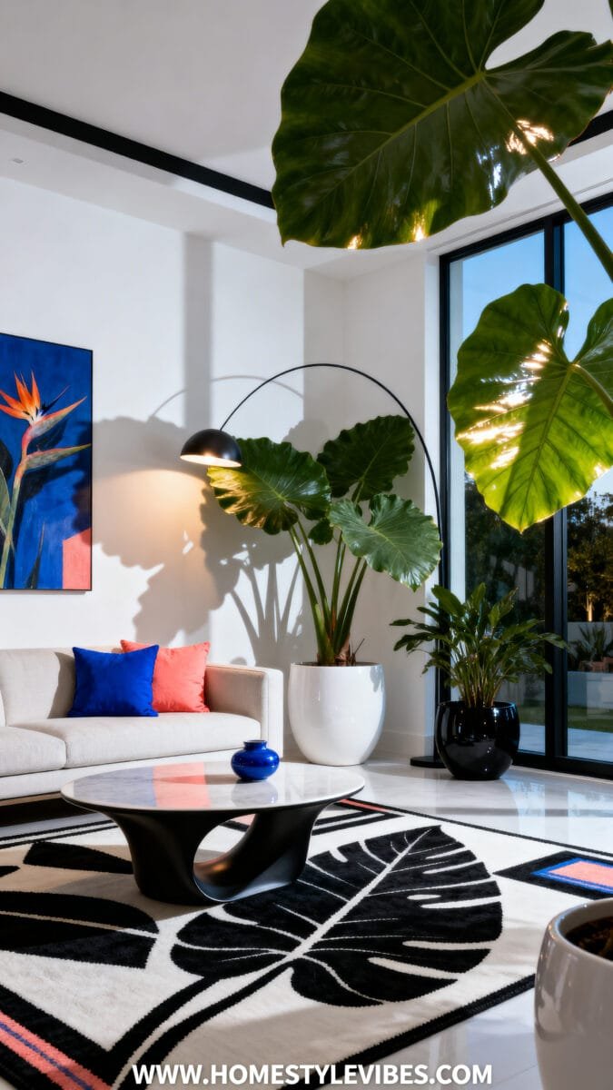 This is your dopamine decor fix: crisp white walls, high-contrast black accents, and bursts of saturated color—think cobalt, coral, chartreuse—balanced by big, tropical leaves. The mood reads energetic, contemporary, and Insta-happy, perfect for entertainers or anyone who wants their living room to feel like a design-forward cocktail. Plants like bird of paradise, alocasia, and philodendron “selloum” deliver high-drama leaves that vibe with graphic patterns on rugs or pillows.
