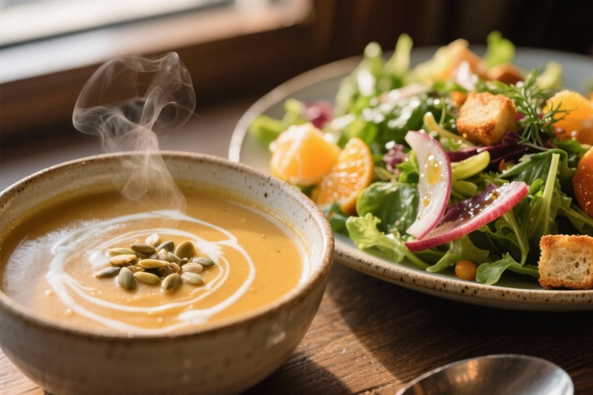 Balance is your best friend. Pair a creamy soup with a crisp salad or a brothy soup with something juicy and crunchy. Aim for contrast: temperature (warm vs. cool), texture (silky vs. crisp), and flavor (rich vs. bright). You’ll eat slower and feel more satisfied—like a little restaurant tasting menu at home.
